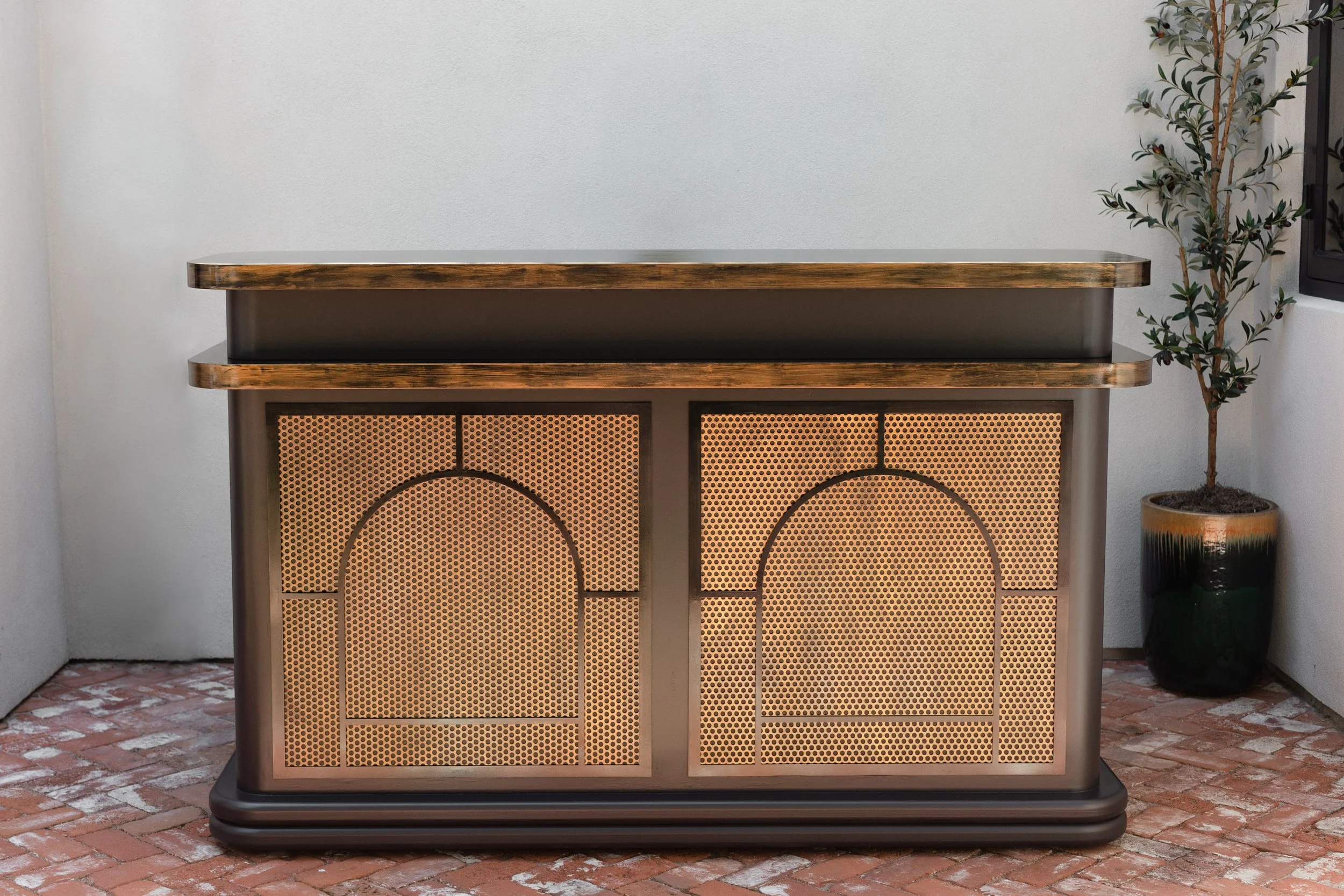 Made with a combination of wood and stainless steel, the design compliments the existing property aesthetics and furniture. Beneath the lower portion of the bar, is a set of custom steel doors with hidden storage.